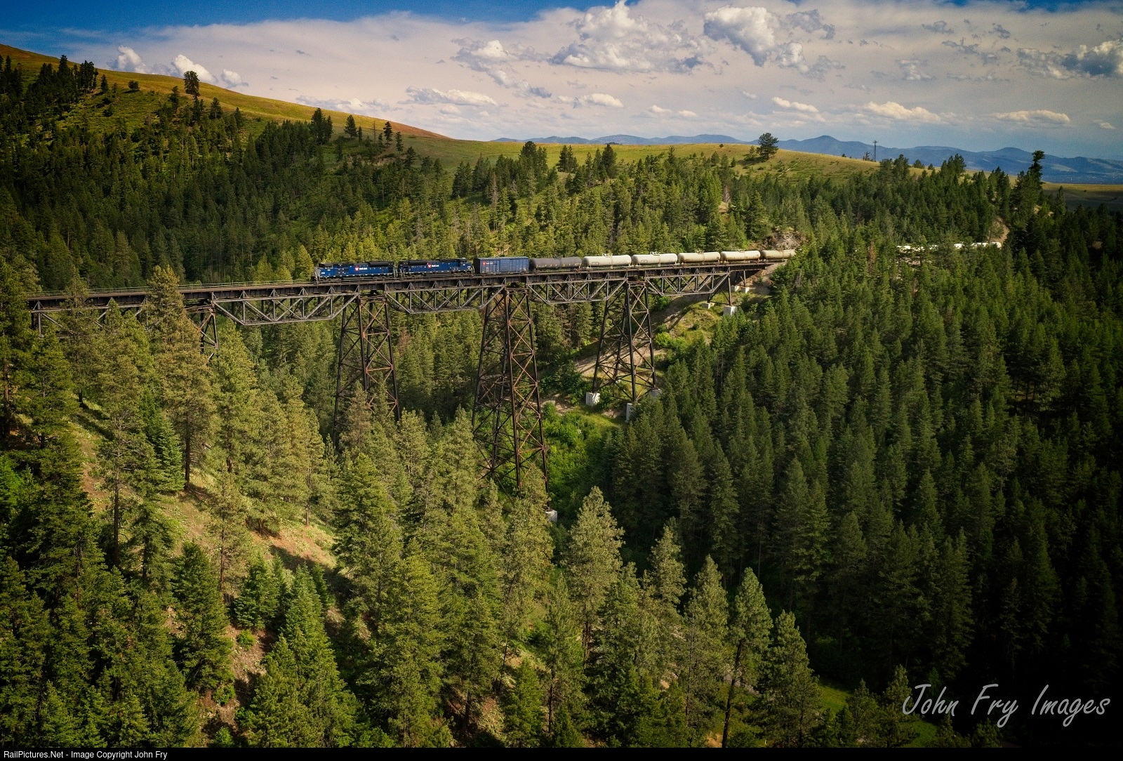 The "Night Gas" dodges clouds as it heads over the 797-foot Marent Trestle west of Missoula, Montana on their way up Evaro Hill.