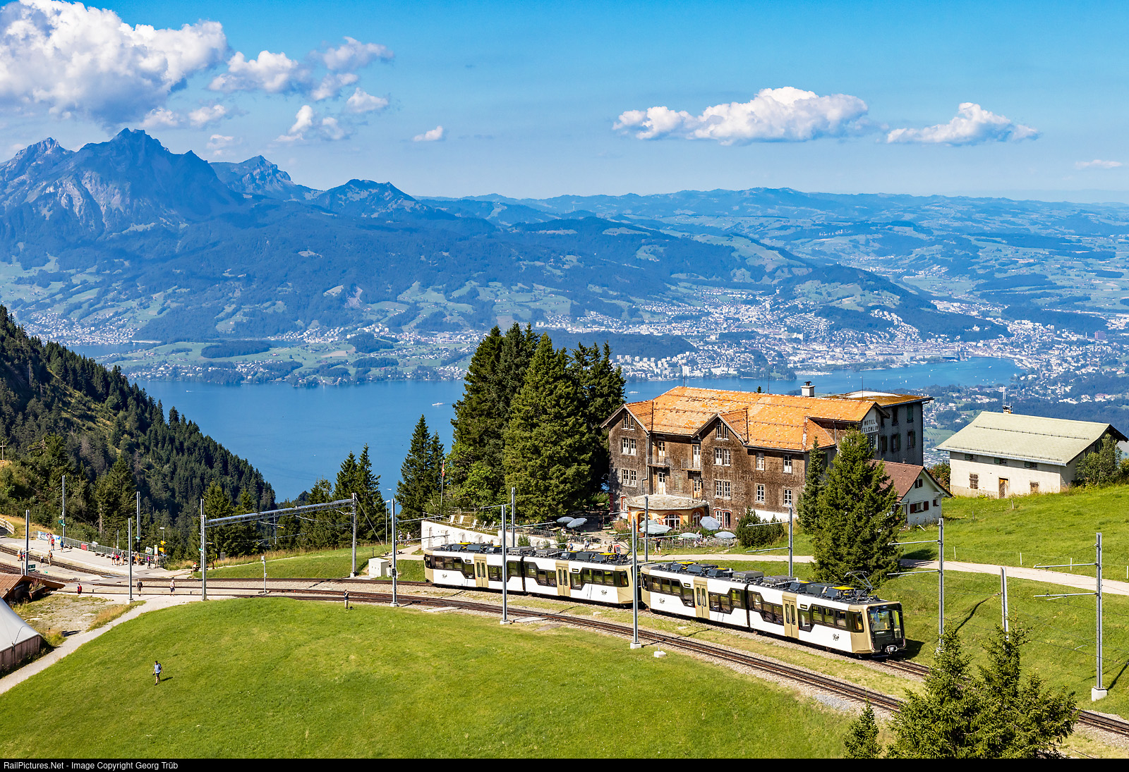 | This is the modern Rigibahnen, with articulated cogwheel railcars Bhe 4/6 # 42 "Victor Hugo" and # 45 "Queen Victoria" in multiple control, running empty downhill to Vitznau as an extra train 1116 above Rigi Staffel. Rigibahnen received 6 of these double railcars from StadlerRail in 2021/22. They are popularly known as "Bratwürste" due to their shape and color scheme. In the background the former Felchlin hotel, mount Pilatus on the left and Lake and town of Lucerne. |