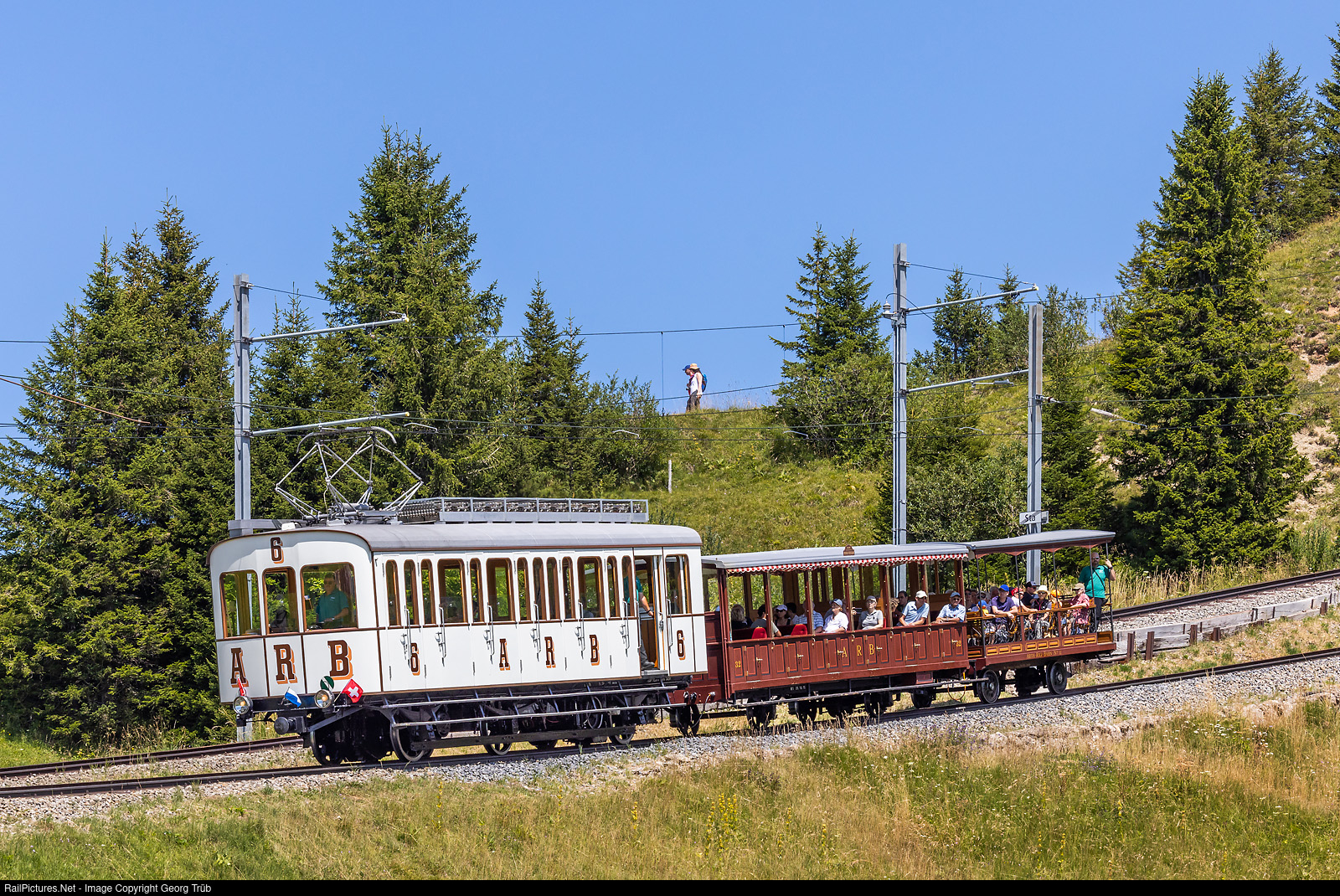 1th of august is Swiss National Day, the trains of the Rigibahnen are adorned with flags of Switzerland, cantons of Lucerne and Schwyz. An there is "Rigi Historic XXL Day", with most of the historic vehicles running up and down the mountain. This is the world's oldest electric cogwheel railcar, BCFhe 2/3 # 6, built in 1911 for the Arth-Rigi-Bahn (ARB), running down the mountain as train CC 152 above Rigi Staffel with cars B # 32 of 1875 and C # 11 "Bambus" of 1889.