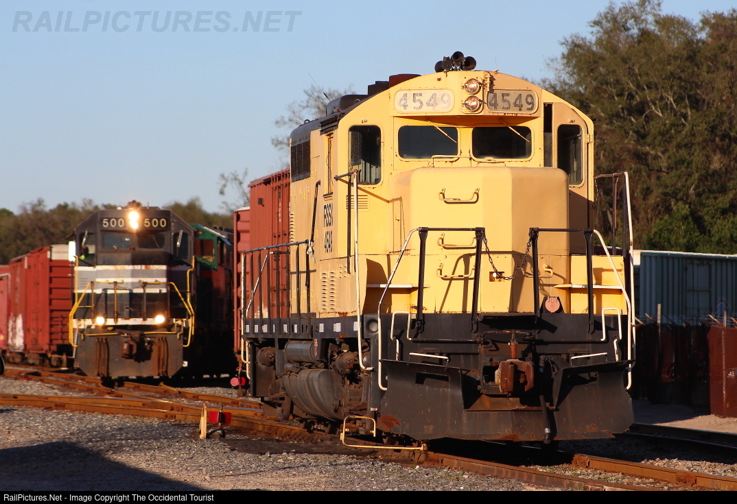 | A late day meet between the switcher in Foley & the Georgia Florida RR with cars from CSXT. The cooler winter months see this happen in daylight, but during the heat of the summer, they tend to switch to overnights. Today's delayed daylight run is coming in about an hour before sunset. 4549 is ex-CNW nee-CRIP. |
