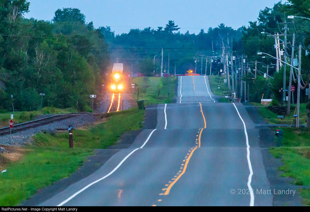 From a distance, NBSR 908 heads through Tracy, New Brunswick.