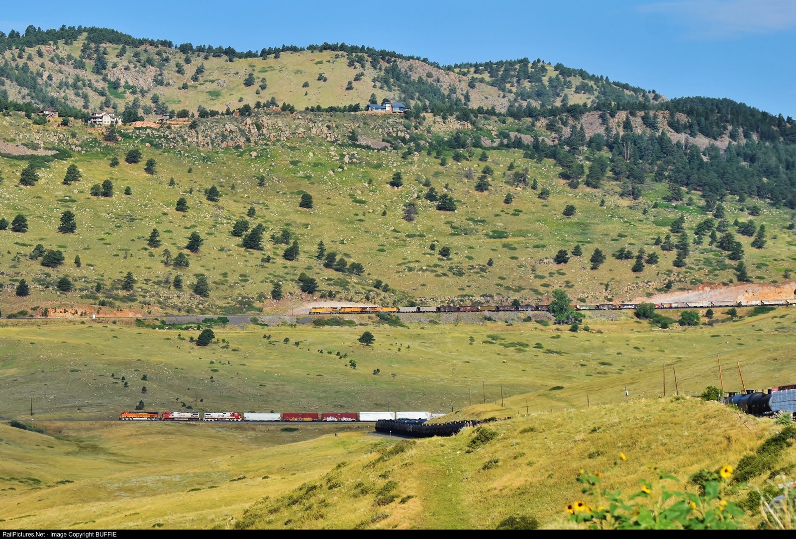 UP 6372 (AC4400CW) runs down the hill at Eisele, Colorado as a BNSF freight with two Warbonnets heads up the Moffat Tunnel Sub.