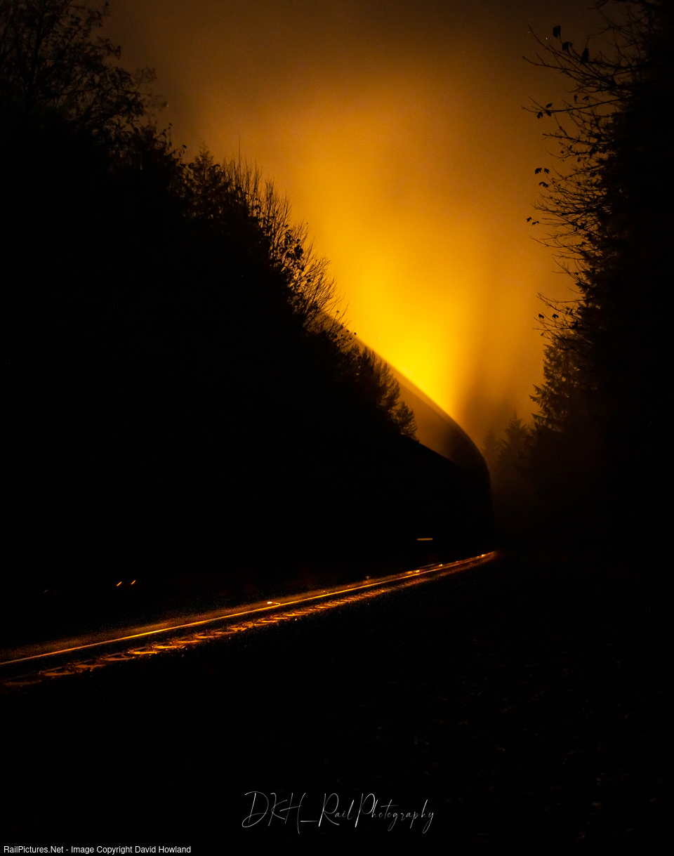 | on a cold, foggy fall night a BNSF coal train holding in the siding lights up the sky as a westbound BNSF z passes with a flaming brake shoe. |