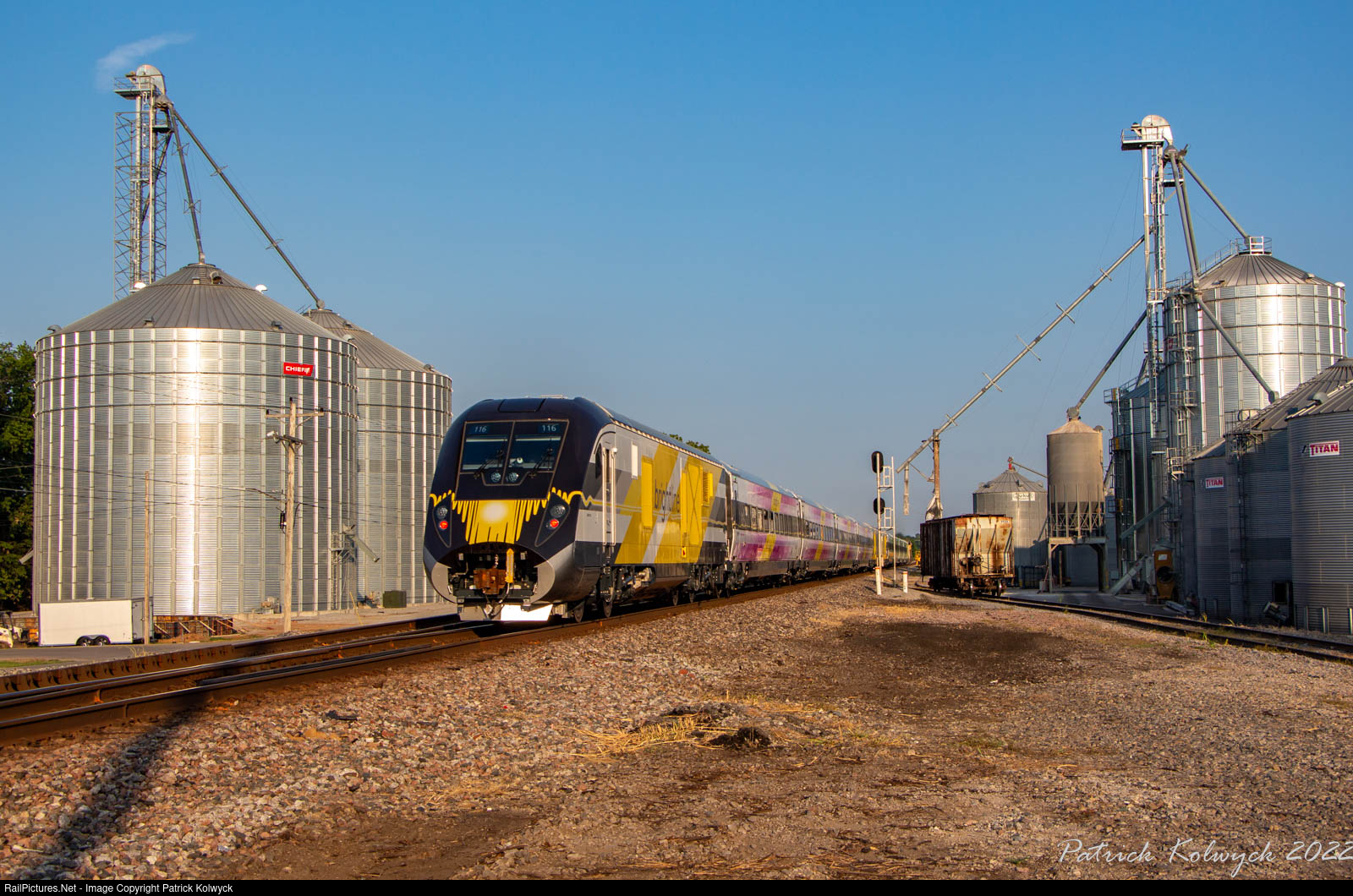| Looking a little out of place, CSX S988-13 with a pair of Brightline train sets enroute to Orlando, FL are seen here passing through Trenton, KY. |