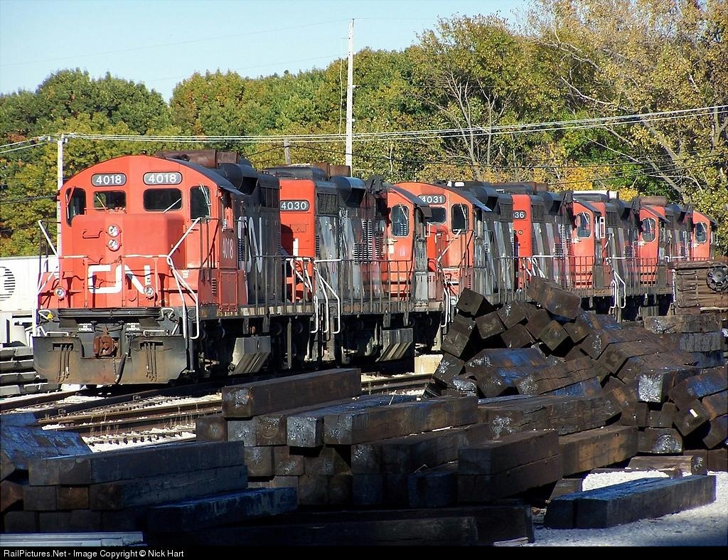 This was a great sight at the engine terminal! OK, Going from left to right: CN 4018 GP9, CN 4030 GP9, CN 4031 GP9, CN 4036 GP9, CN 4040 GP9, CN 4045 GP9, and CN 4048 GP9! 7 GP9's on one train is absolutely amazing!