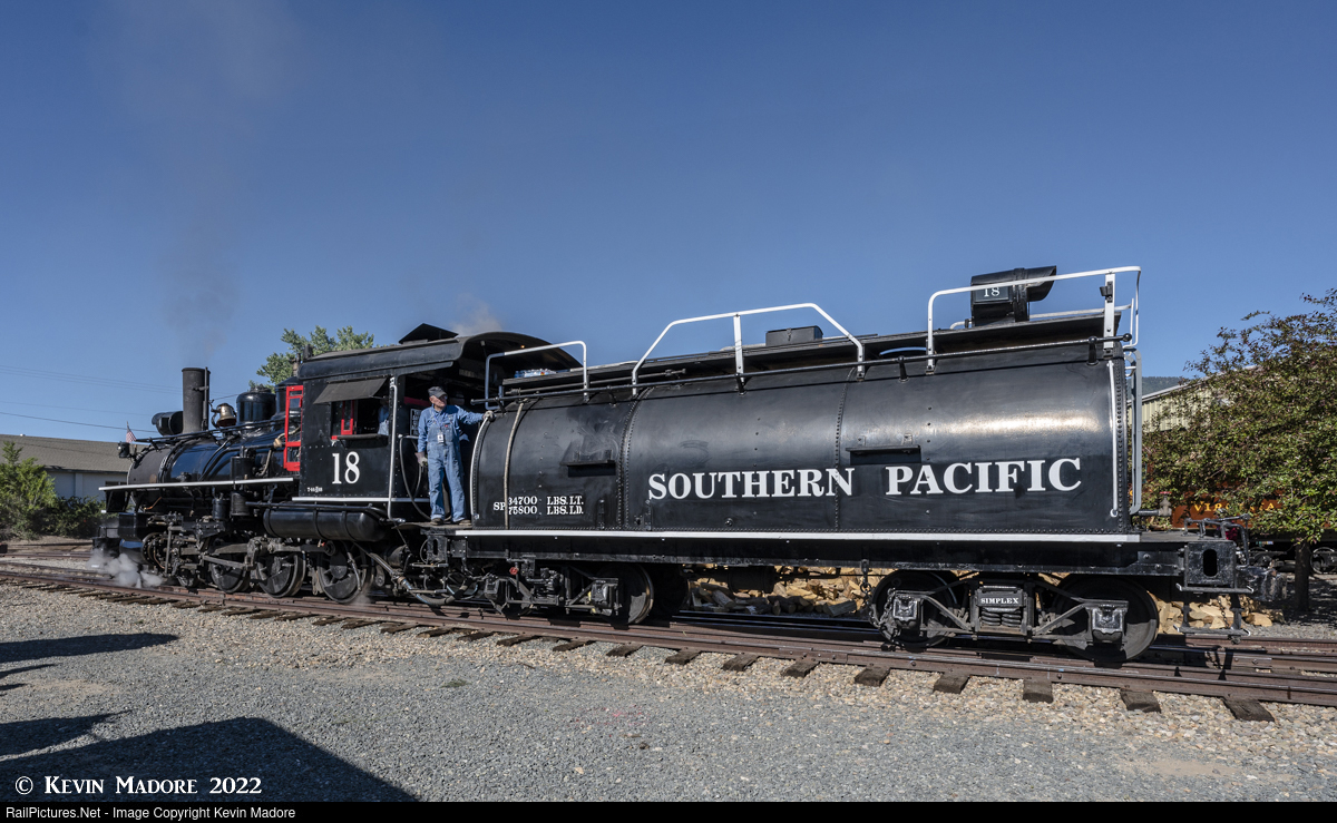 Heading for the loop. With Nevada State Railroad Museum Pilot Barry Simcoe clearing from the gangway, Southern Pacific Locomotive #18 comes off the gallows-style turntable, backing northbound on the A-track, headed for the museum's dual-guage loop track. This beefy little 4-6-0 was brought to the "Great Western Steam-Up" event by the Carson & Colorado Railway of Independence, CA. Today, the 18 will be hauling the event's narrow gauge passenger train. An oil-burner, SP #18 is one of the few surviving, operable steam locomotives to feature a "whale-back" tender, so-named because the tank top is rounded, similar to the back of a whale. The only other one I am aware of is the 2-6-2 #12 at Colorado's Georgetown Loop.