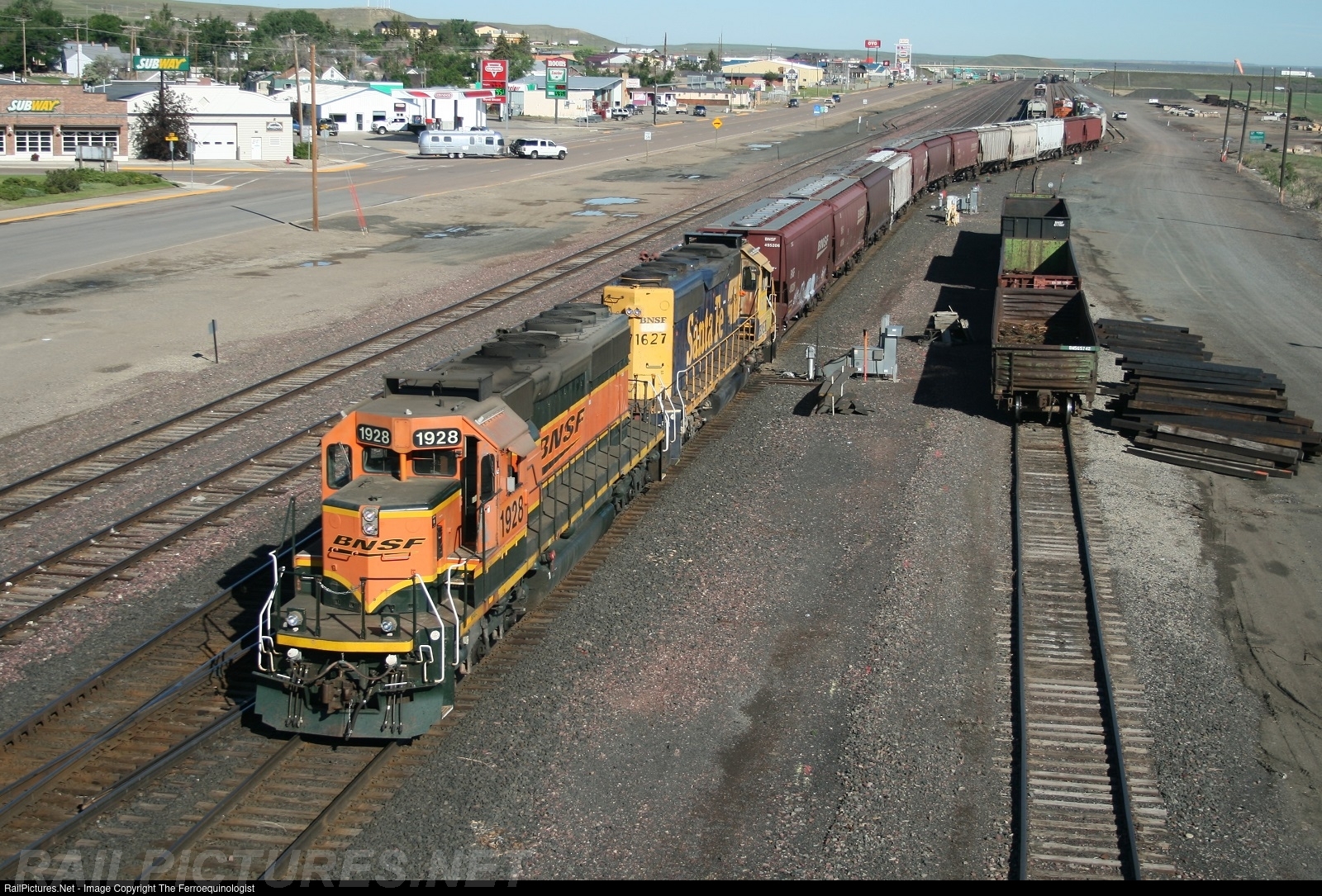 A pair of SD40-2s, one of them in former Santa Fe paint, build and sort cuts of cars in the yard at Shelby on a pleasant July morning. There wouldn't be any trains running until later that afternoon due to trackwork at Piegan, giving this switch job a large work opening.