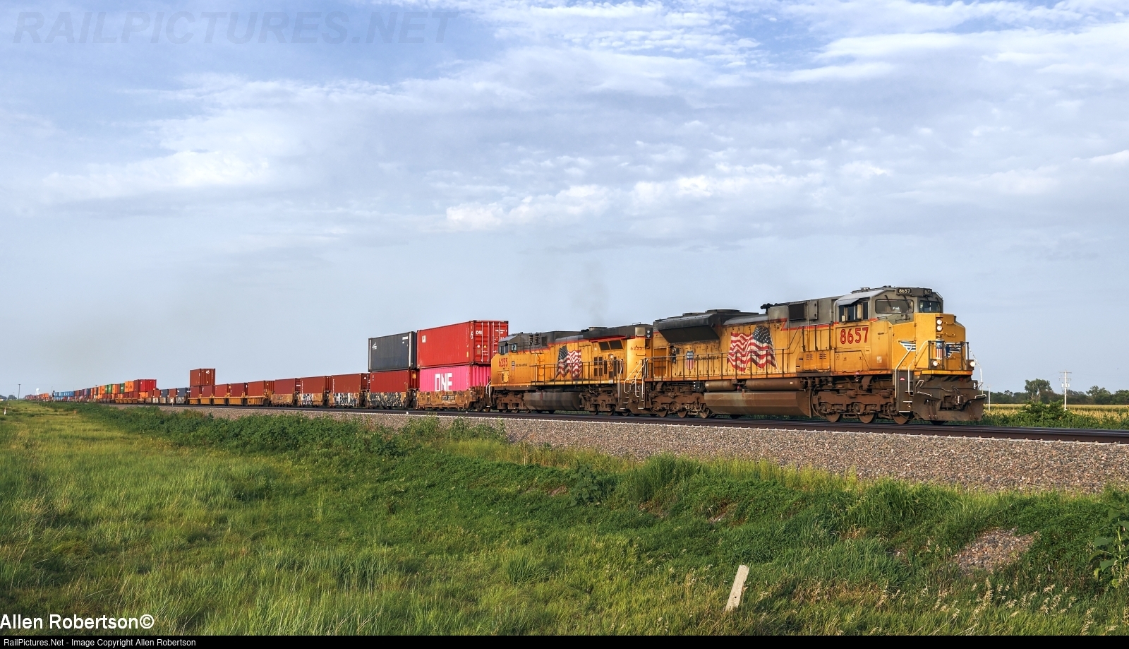 UP 8657 & 6255 westbound with a stack train.