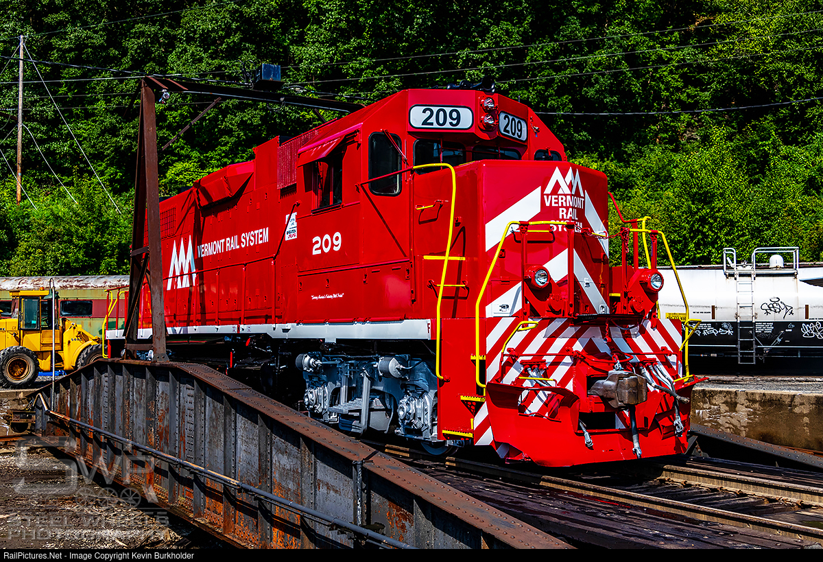 The first of 8 geeps being painted for Vermont Rail System has emerged, wearing the new brand but classic colors of the Vermont Railway. Formerly GMTX 2663, the VTR 209 kicks off the rebranding and painting of the VTR 201, 202, 206, 207, 208, 209, 210, and 313. Taken at Walpole, NH.