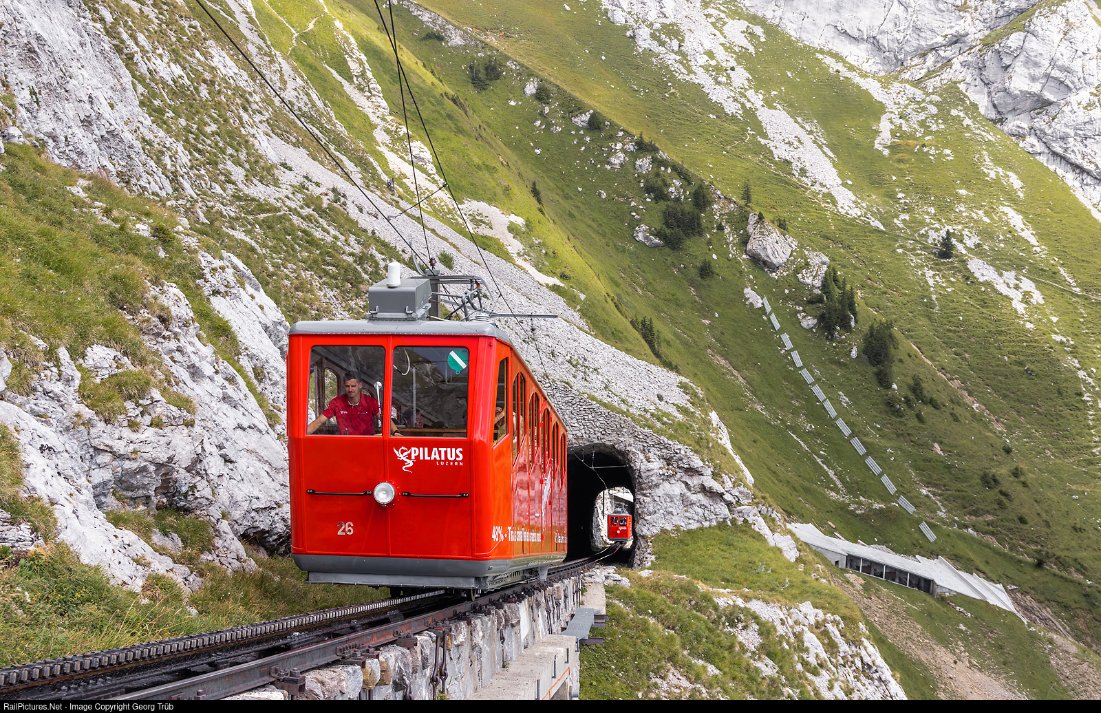 Cogwheel railcars Bhe 1/2 # 26 and # 21 of the Pilatusbahnen, both built in 1937, are following each other on sight distance through the Eselwand, running as part of train CC 17 from Alpnachstad to Pilatus Kulm. Train 17 consisted of the railcars Bhe 2/2 # 41 from 2021 and the Bhe 1/2 # 25, # 26, # 21 from 1937 and Bhe 1/2 # 30 of 1967, following on sight distance.