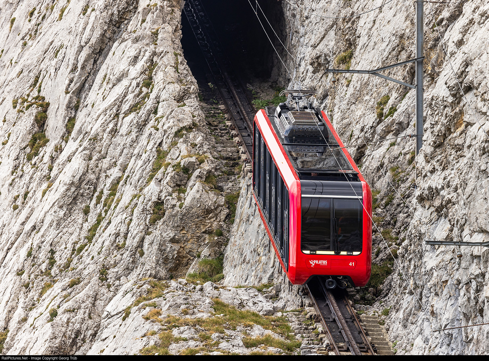 | Brand new cogwheel railcar Bhe 2/2 # 41 of the Pilatus Bahnen is running down on the 48.0 % grade through the Eselwand (donkey wall) as train CC 14 from Pilatus Kulm to Alpnachstad. The Pilatus Bahnen get 8 of this new railcars from StadlerRail and Calag Langenthal (carbody) to replace the 9 old railcars Bhe 1/2 # 21 to # 28 from 1937 and # 30 from 1967. The new railcars will run as two car trains in multiple control and circulate slightly faster then the old, enabling a 30 minutes timetable instead of the 40 minutes interval timetable now. |