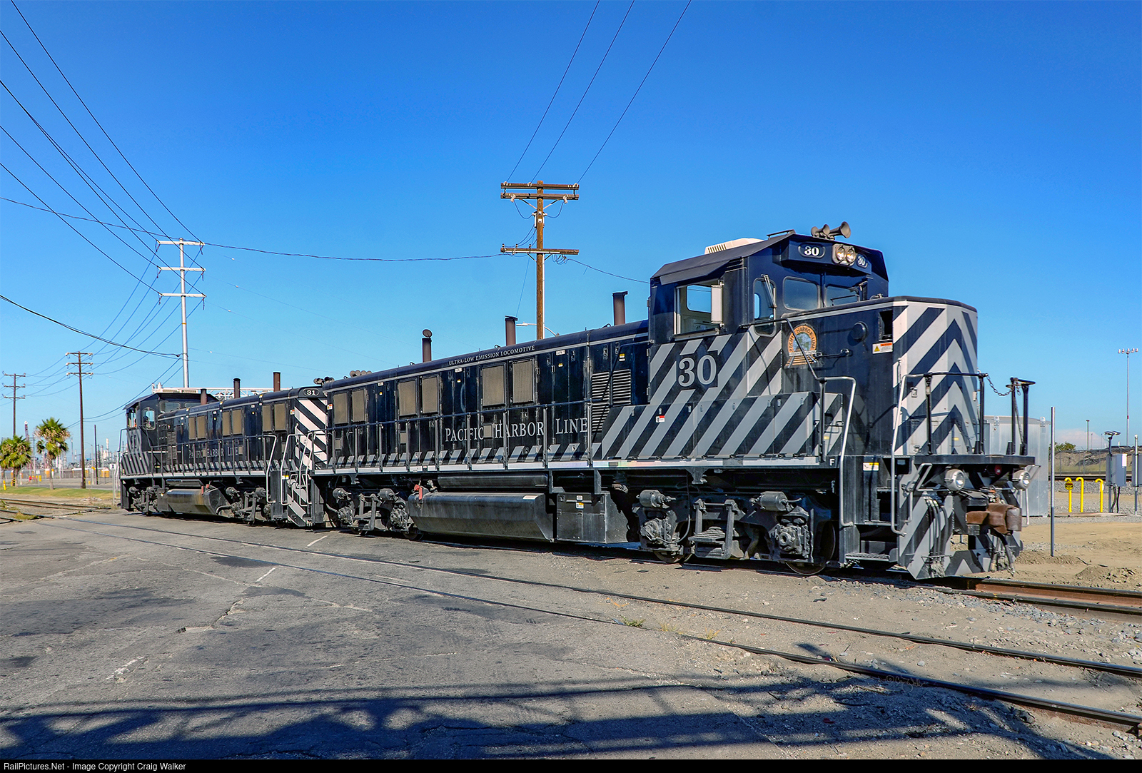 While checking out the location of the Pacific Harbor Line's former enginehouse at their now-gone Pier A Yard, a pair of NRE 3GS21B locomotives, PHL 30 and 31, were found crossing Alameda Street where it becomes Harry Bridges Boulevard in LA’s Wilmington neighborhood. PHL's new yard and engine facility are just behind the locomotives in this shot. (Los Angeles, California – August 15, 2014)