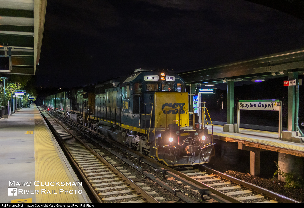 Pennsy On Central. On the night of Tuesday, August 9, 2022, CSX M704-09 (Oak Point, NY-Selkirk, NY) passed through the MTA Metro-North Railroad Spuyten Duyvil Station with CSX 8881 leading (SD40-2 , ex-Conrail 6326/6991, née-Pennsylvania Railroad 6073, SD40, EMD, 2/1966). The trailing unit, CSX 468 (AC44CW) is a class that has become far more common here, so catching the EMD leader was a bit lucky. This train is a daily turn to bring refuse, lumber, food, construction debris, plastic pellets and other products to and from New York City as the sole daily manifest road train to serve the 5 boroughs, and also the only one to serve the former New York Central Railroad Hudson Line. CSX recently renamed its trains, in this case redesigning the mixed manifest consists from Q to M.