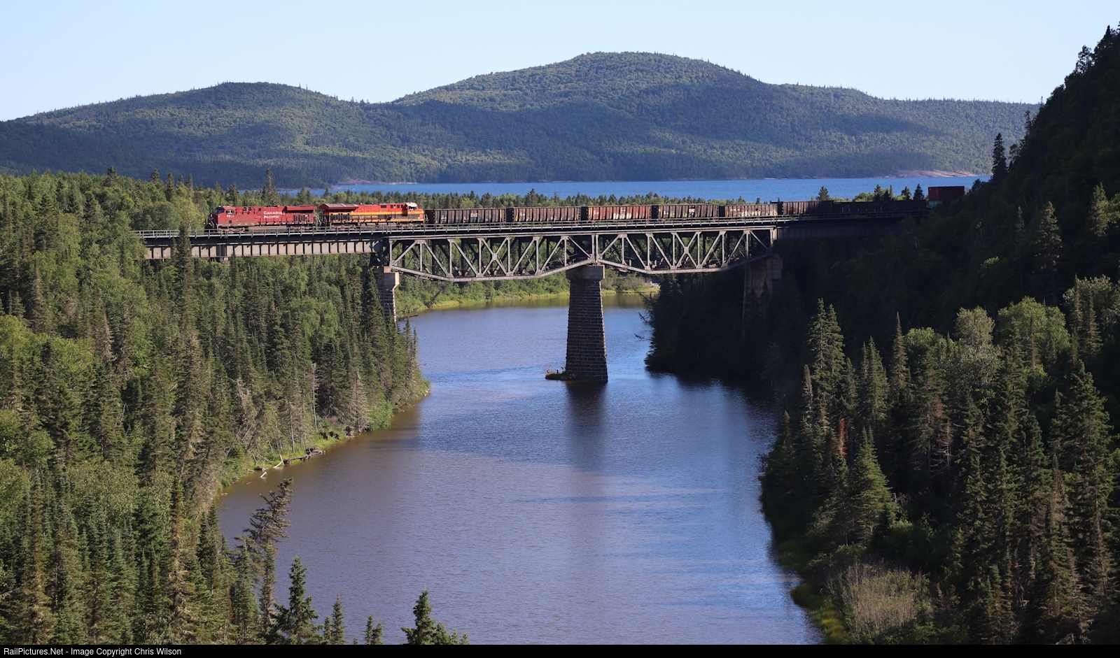 CP 9376 + KCS 5019 pull 420's freight across The Little Pic River trestle on a beautiful evening