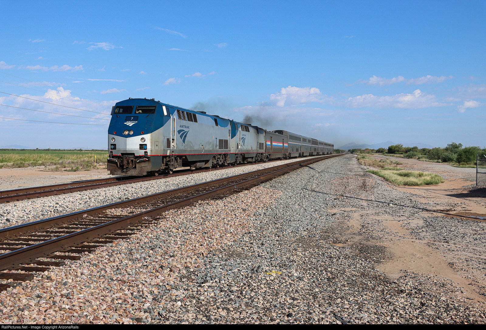 | Amtrak's eastbound Sunset Limited rolls into the growing city of Casa Grande on a cool summer morning with one of the first P42 locomotives to be built nearly 26 years ago on the point of this train bound to New Orleans. |
