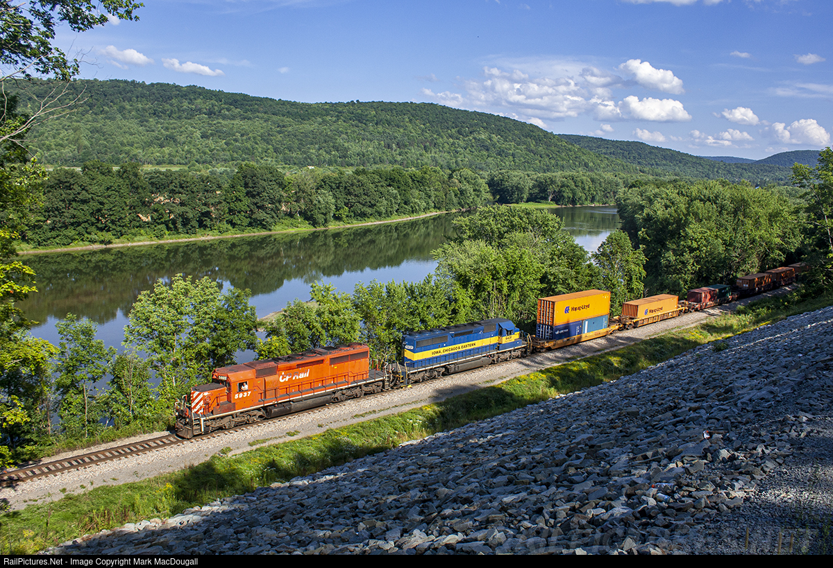 | CP 159 has spent the entirety of its trip from Philadelphia in Pennsylvania, and is about to cross into New York State for the small remaining portion up to Binghamton with CP and ICE SD40-2s. |