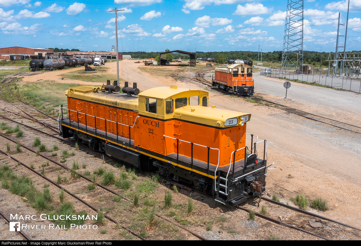 Railroading Hurts. On the scorching hot afternoon of August 11, 2021, Ouachita Railroad GMD1 (OUCH) 23 (née-CN 1055, GMD1, 10/1959) rests at the South Arkansas Intermodal Park in Camden, Arkansas. Of 101 units built between 1958-1960, 96 were delivered to Canadian National Railways and 5 to Northern Alberta Railways, also going to CN after NAR was acquired. CN retired its last GMD1 in April of 2021, and a small number survive today, including one restored at the Waterloo Central Railway. In the background, Camden & Southern (CSR) 20 (SW9, EMD) sits awaiting its next move.