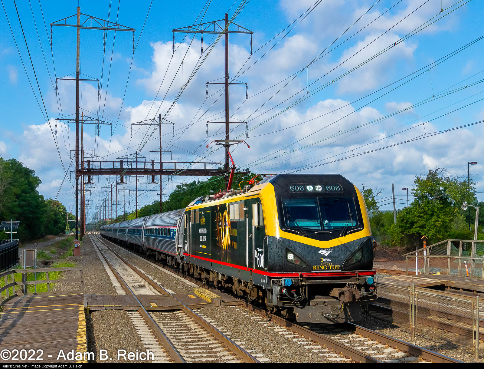 King Tut in Edison: National Geographic ad-wrapped ACS-64 #606 outruns approaching shadows as it passes NJ Transit's Edison station on a Sunday morning.