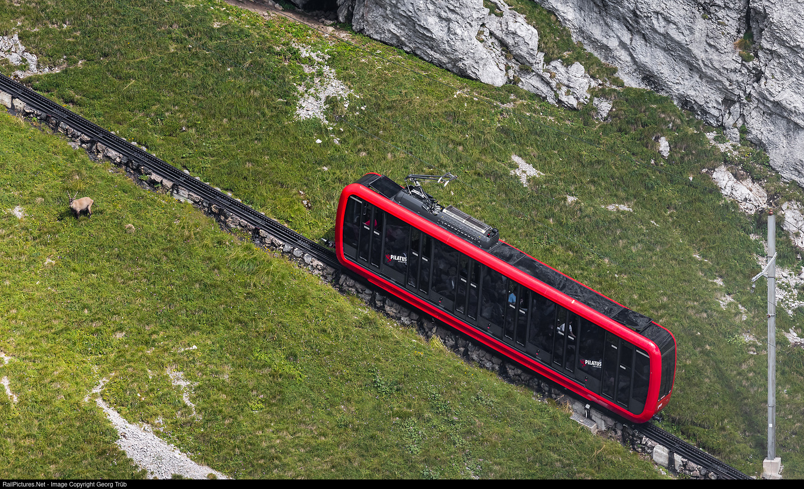 | When the new cogwheel railcar Bhe 2/2 # 41 of the Pilatus Bahnen came up the mountain as first railcar of train CC 24 (which consisted of 5 railcars following on sight distance), the capra ibex (Capricorn) was rather near the track and slowly moved only very few meter more away. |