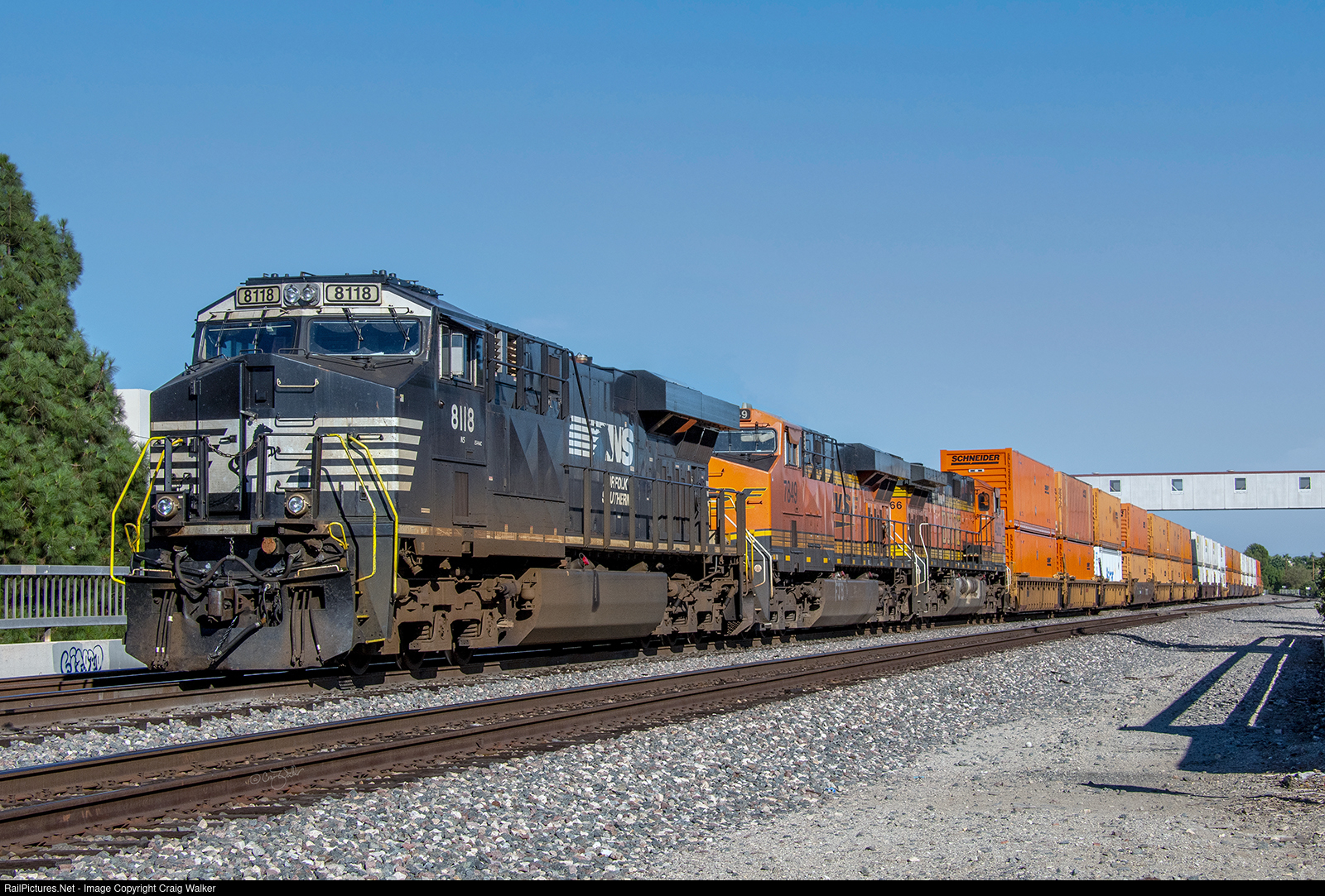 Holding Track 2 (of three mainlines) as it awaits an opening at Los Angeles' Hobart Yard, and also awaiting a fresh crew as permission to proceed its final 16 miles, is BNSF Guaranteed Service Intermodal train Q-ATGLAC6-28L, which originated in Atlanta, Georgia. "Guaranteed Service" these days, however, likely doesn’t mean what it should, as crew shortages have dozens of westbound trains backed up for hundreds of miles on the BNSF's San Bernardino Sub, Cajon Sub and Needles Sub, creating delays of not just hours, but days. There is another westbound stopped two miles behind this train, and most likely another two miles ahead of it as well. Q-trains are the second highest priority trains on the BNSF (after Z-trains), and sitting without a crew for this long would have never happened a few years ago. This train, with Norfolk Southern ES44AC 8118, BNSF ES44DC 7849 and BNSF Dash 9-44CW 4366 for power, was still sitting in the same location the next morning, and when I checked last was 99 hours 3 minutes behind schedule! (Buena Park, California – August 11, 2022)
