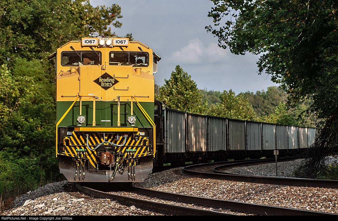 Westbound coal empty 77J holds the siding for an eastbound with the Reading heritage unit up front.