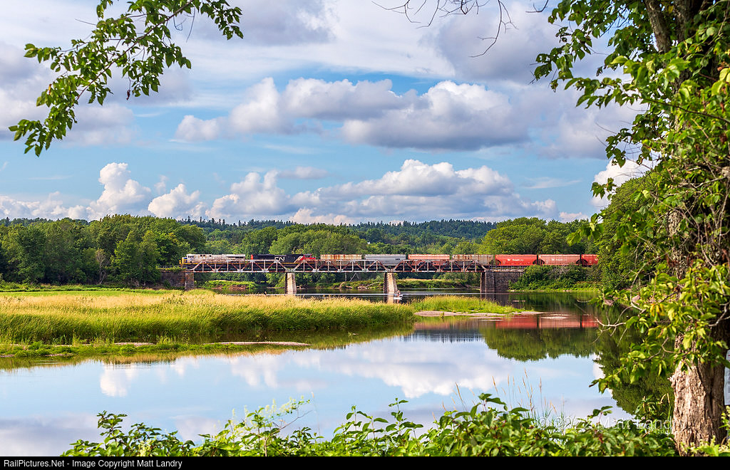CN 3928 powers train 594 as they cross a trestle over Kennebacasis River, at Hammond River, New Brunswick, on a beautiful summer afternoon in Southern New Brunswick.