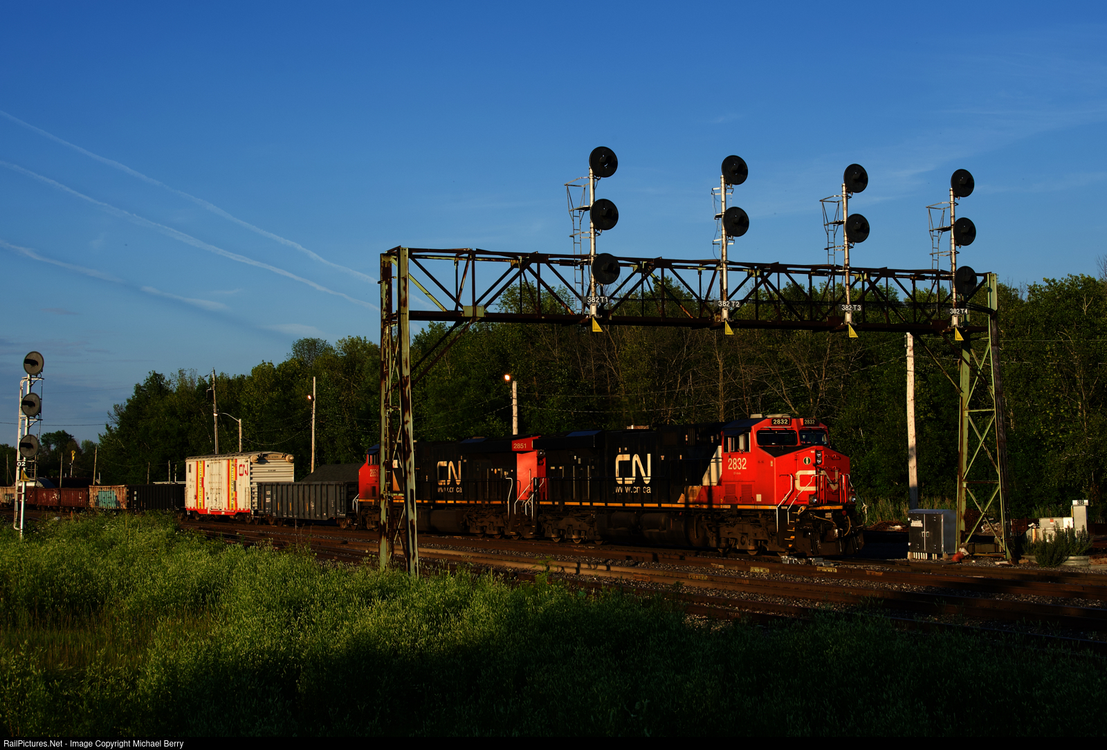 | CN 321 is passing under a classic Kingston Sub signal bridge at Coteau Jct on a warm evening as it prepares to set off an inspection boxcar (the second car from the head end) and lift cars before continuing west. The searchlight signals at far left are for the Alexandria Sub, which joins the Kingston Sub here. |