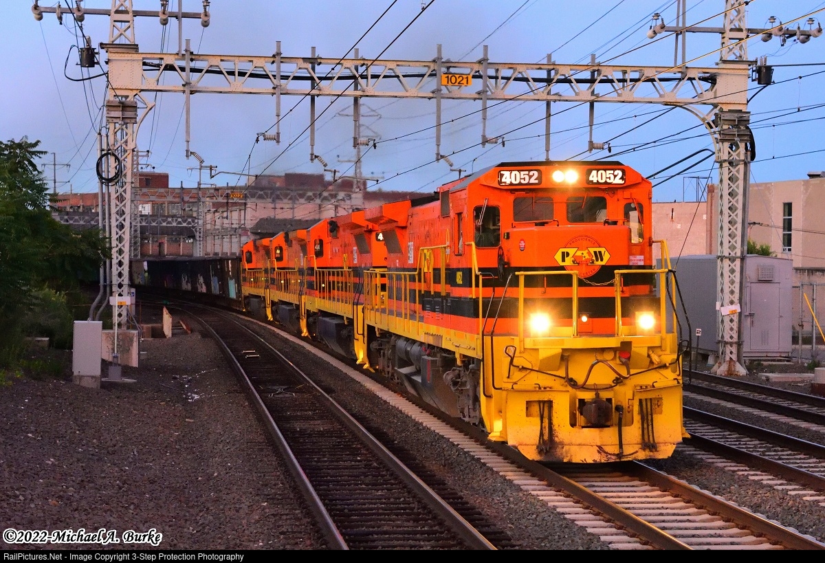 On Tuesday, July 26, 2022, a quartet of Providence & Worcester standard cab C40-8s is lit up by the last rays of the evening sun, as loaded stone train CHFP from Cedar Hill to Fresh Pond Yard in Queens, NY, traverses Armstrong Curve on Metro-North's New Haven Line in West Haven.