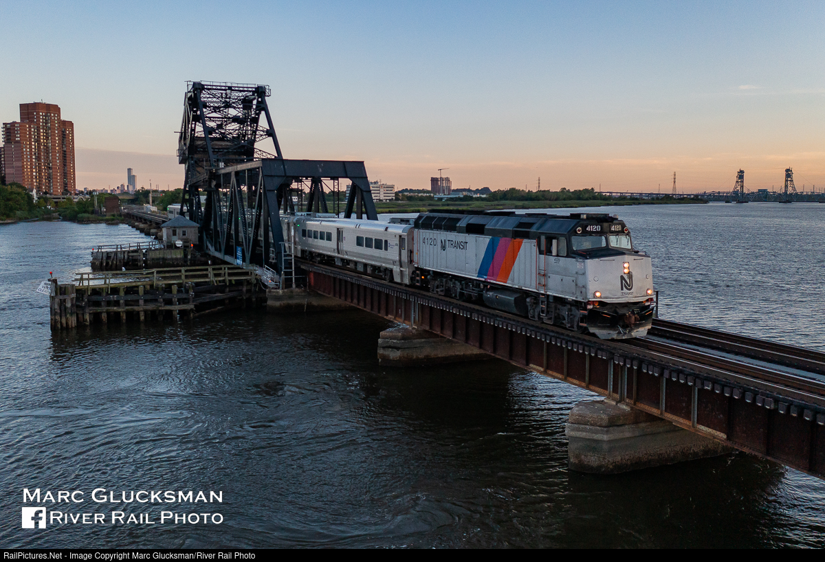 Cowl Crossing. A slightly premature dusk was created by clouds as NJTR 4120 (F40PH-2CAT, EMD) led NJ Transit Train 1881 over HX Draw crossing the Hackensack River from Secaucus to East Rutherford, New Jersey on the evening of Sunday, August 14, 2022. Of the original 17 F40PHs delivered in 1981, 4120 is one of 2 (4119 is the other) of these modern cowl units that remain in service with NJ Transit. After being relegated to work service, the units have found their way back to he active fleet in recent years. HX Draw was completed in 1911 for the Erie Railroad by Joseph B. Strauss of the Strauss Bascule Bridge Company of Chicago IL, one of the first steel trunnion bascule bridges in the world. This bridge carries Pascack Valley and Bergen County Line trains, in the background Upper Hack Lift carries Main Line trains.
