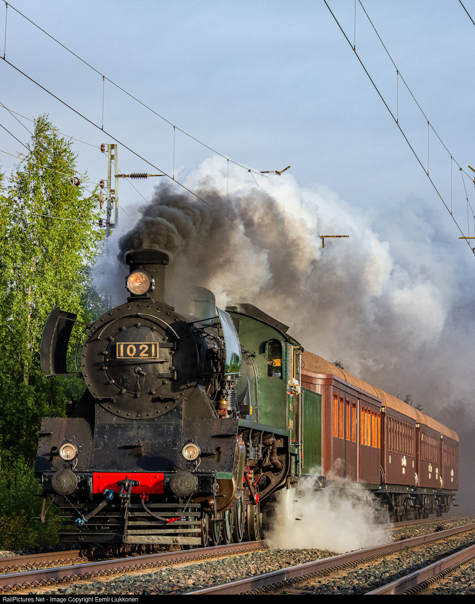 | As the sun is arising from the horizon on 7 A.M., a class Hr1 pacific number 1021 is puffing gloriously to Helsinki. From there it will serve as a train which caries visitors to railway museum day 2022. |