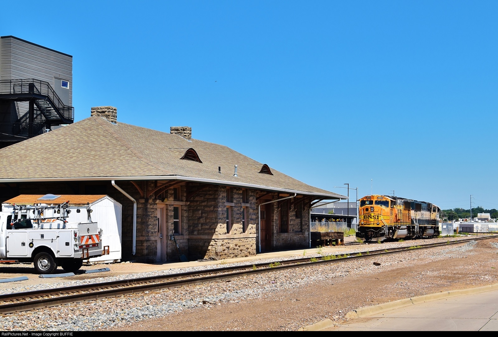 A pair of BNSF MAC's hold station at the historic depot in Longmont, Colorado.