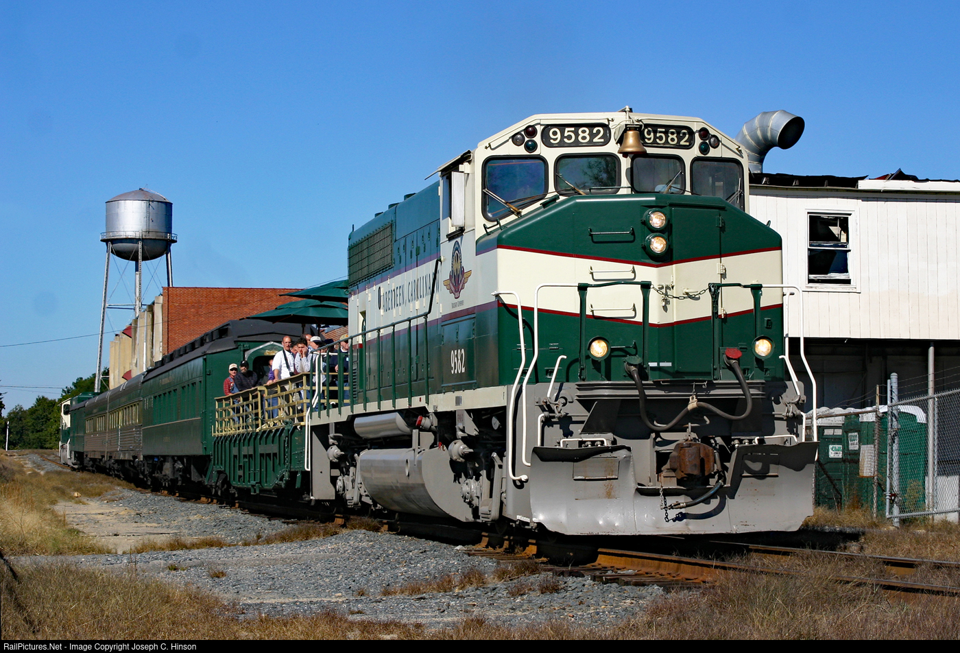 | Aberdeen, Carolina & Western Railway passenger excursion passes by an old Springs Mills in Troy, North Carolina in 2005. ACWR 9582 is an EMD GP40-2LW built for Canadian National in 1975 with the same number. It was initialy leased by the ACWR as TBRX 9582 from Taylor Rail Group. |