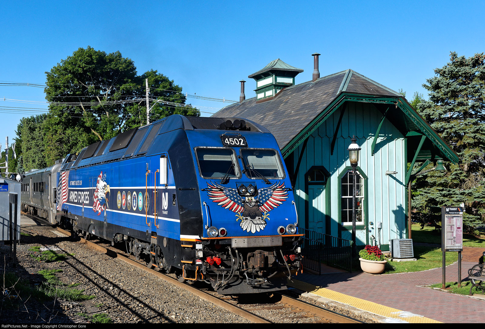 NJ Transit's Armed Forces tribute locomotive passing the Park Ridge Depot on the Pascack Valley Line.