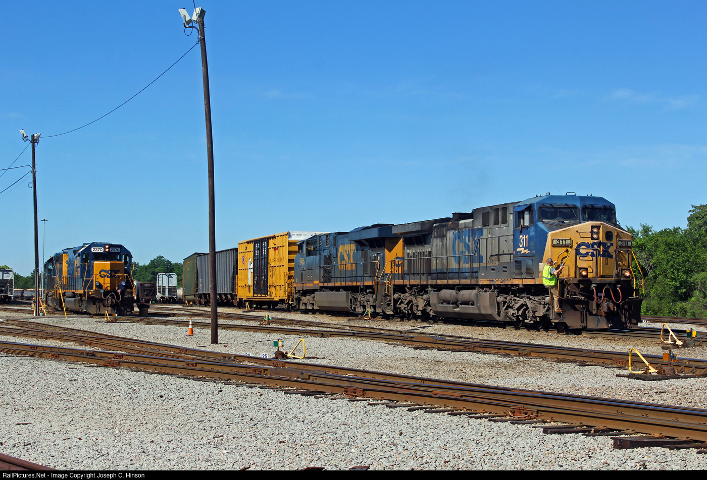 | Two crews are on different trains in the ex-Seaboard Air Line yard in Cayce. A conductor climbs aboard CSXT AC4400CW #311. The set of locomotivs came in on Train 211 a few mnutes prior with a different crew. This crew coupled onto a row of cars and left out of the north end of the yard. |