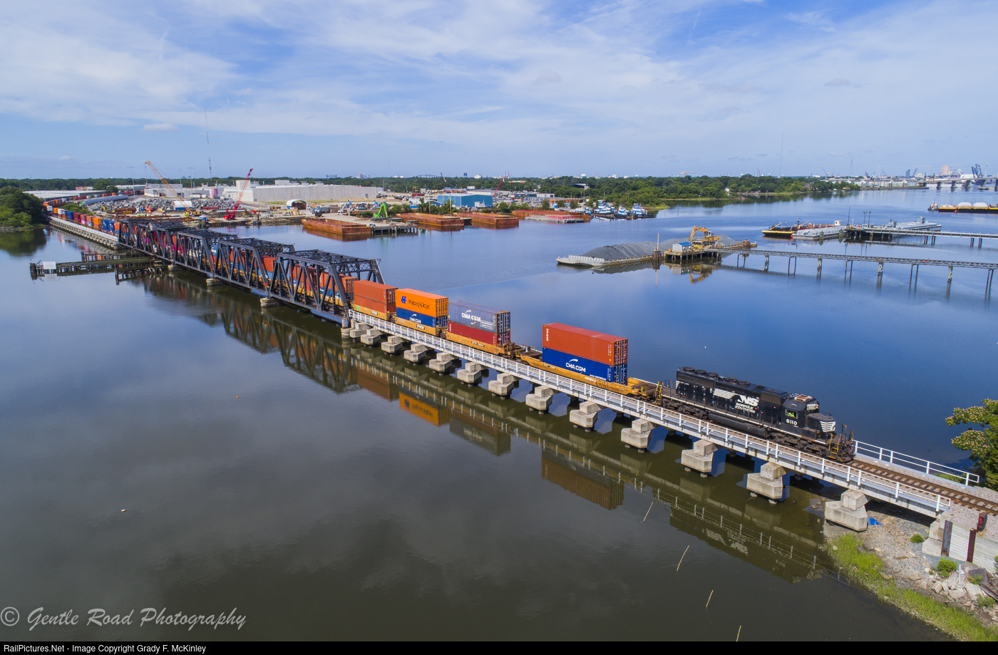 | NV-01 crosses the eastern branch of the Elizabeth River in Norfolk, VA on a beautiful July morning. The bridge, originally a double-track structure used by Virginian and the Belt Line was re-built in the 1970's after a fire. Every single piece of coal hauled by the Virginian Railway to Sewells Point crossed the river here. |