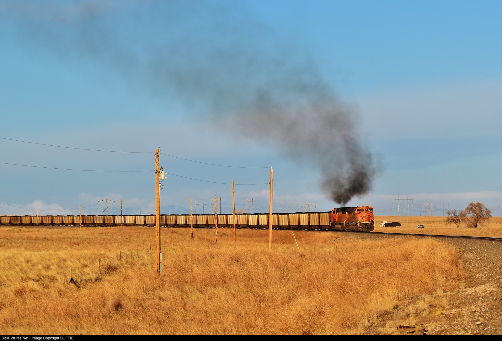 A BNSF motor makes like a Baldwin as it muscles a loaded coal train through Roggen, Colorado.