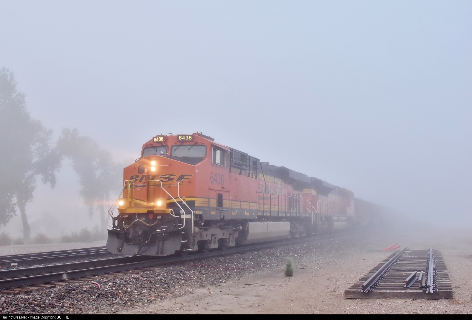 BNSF 6436 (ES44AC) emerges from the fog as it heads east with a coal train on the Brush Sub.