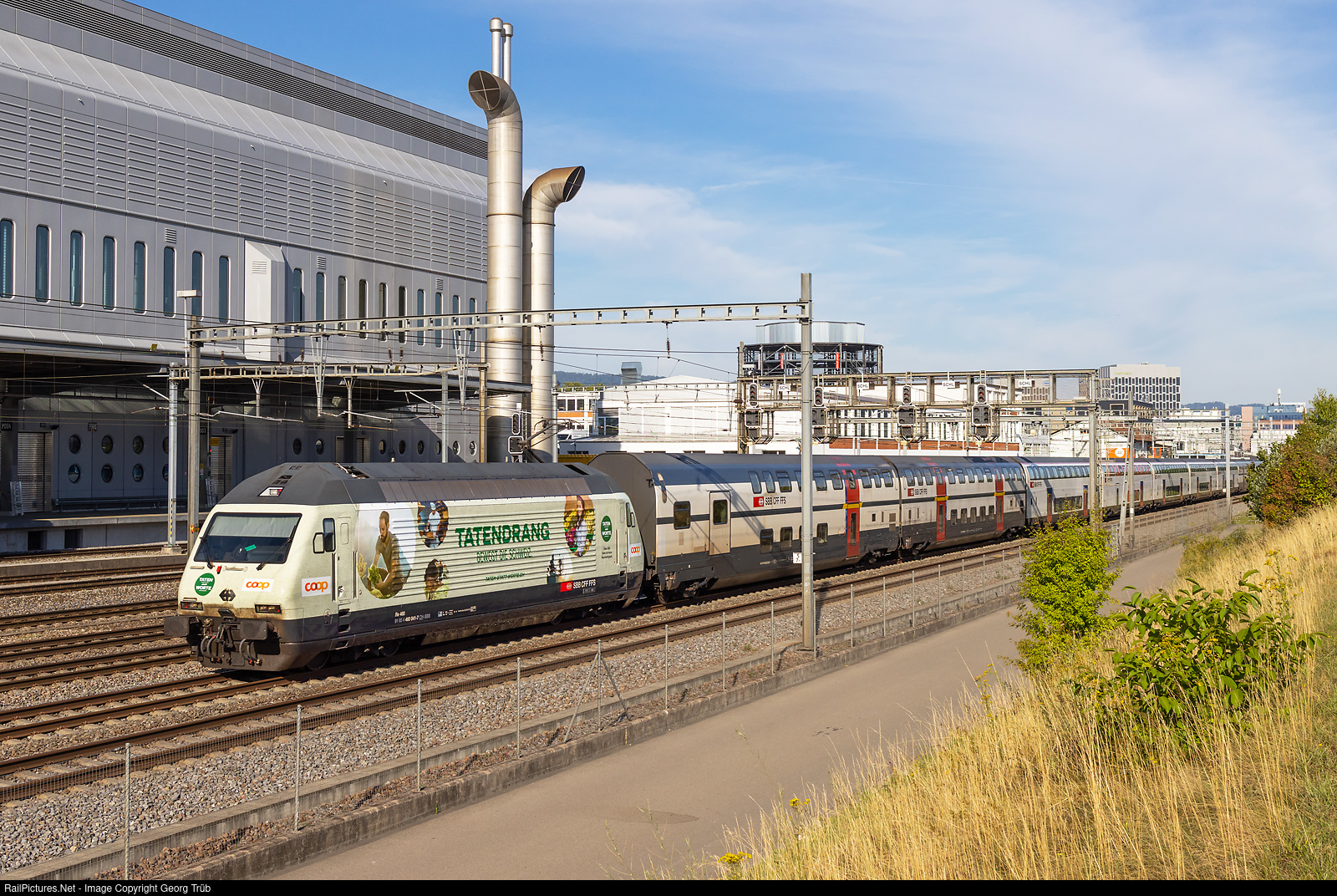 | Re 460 # 041 of the SBB, in the publicity paint scheme "Tatendrang" of the Coop retailer, is pulling the doubledeck IC 809 of the line IC 8 from Brig via Berne to Romanshorn, between Schlieren and Zürich Altstetten. |