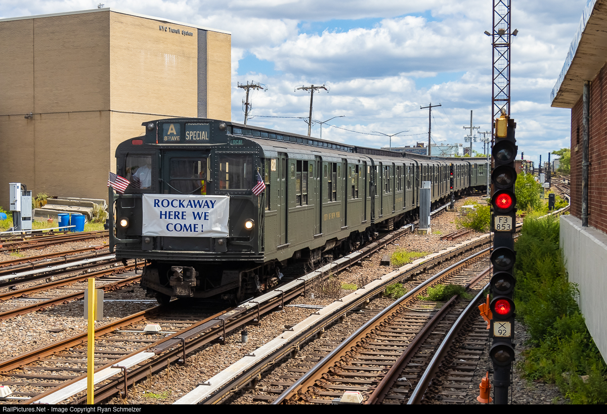 | On 8/13 the NYC Transit Museum offered a nostalgia ride on their R1-9 cars from 96th St. on the Second Avenue Line out to Rockaway Park on the Rockway Line, with a return trip to 175th St. on the 8th Ave. Line. Here the train is making a move into the Rockaway Park yard to lay over for a few hours. |