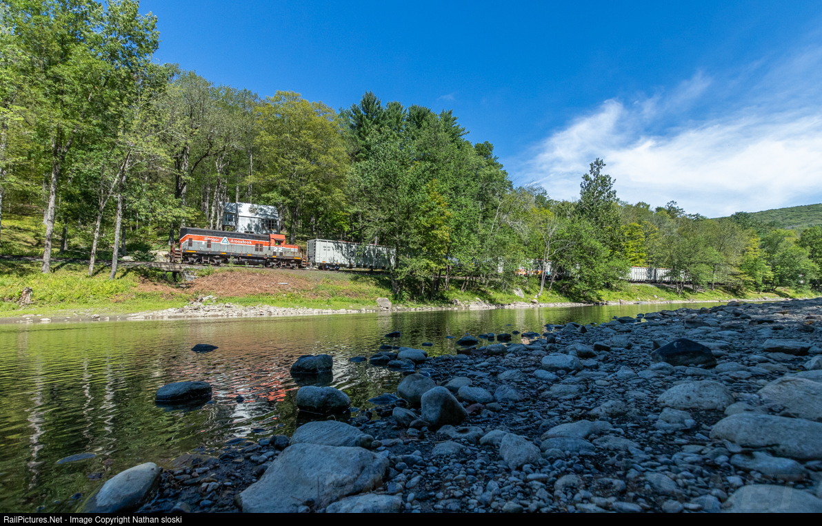 Housatonic RR's NX10 rolls north along a low Housatonic River with ex Bangor & Aroostook GP7u No 22 in the lead.