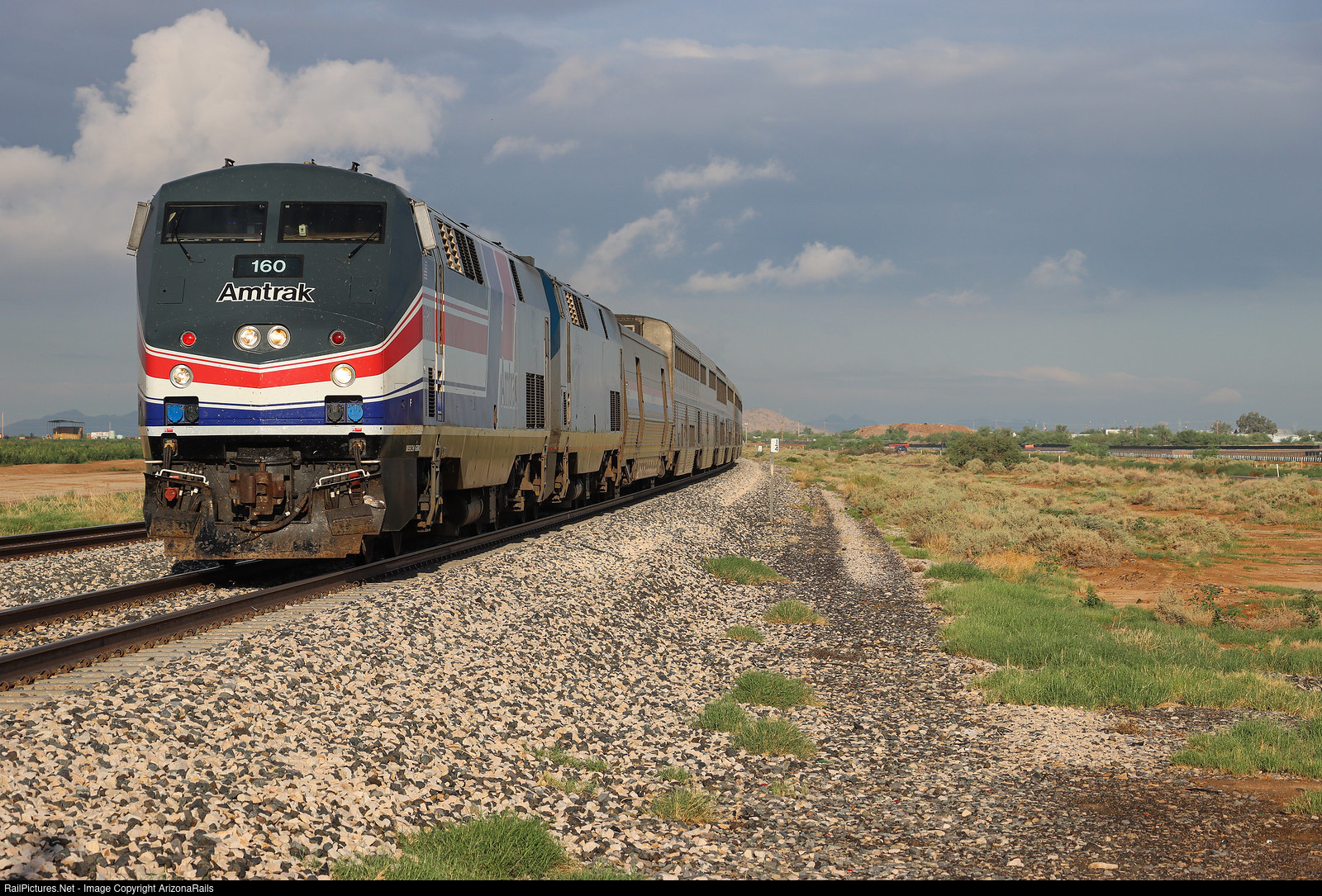 A break in the monsoon clouds made a difference as the sun came out just in time for Amtrak's Saturday edition of the eastbound Sunset Limited, rolling into the city of Maricopa on a humid August morning, running nearly 2 hours late. Leading the way is one of Amtrak's 50th Anniversary heritage locomotives, this one honoring the Phase III scheme the Dash 8 locomotives had in the 90's, also referred to as the "Pepsi Can" paint scheme.