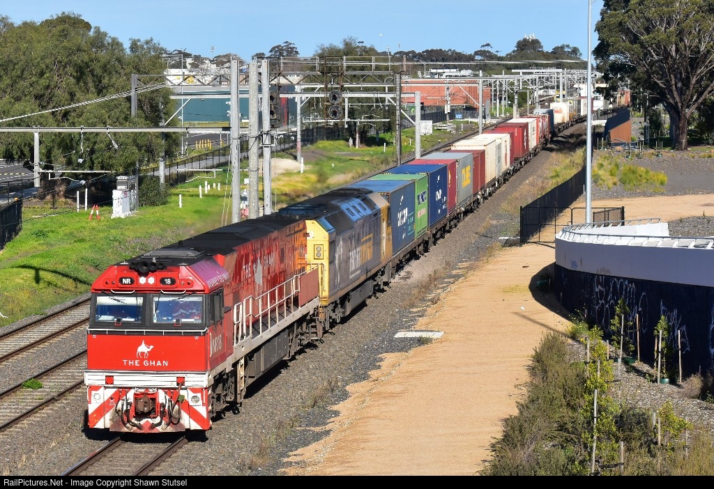 | Pacific National's NR18 (Ghan) and AN3 rumbles through Werribee, Melbourne with 7AM5, Intermodal Service ex Adelaide, South Australia...