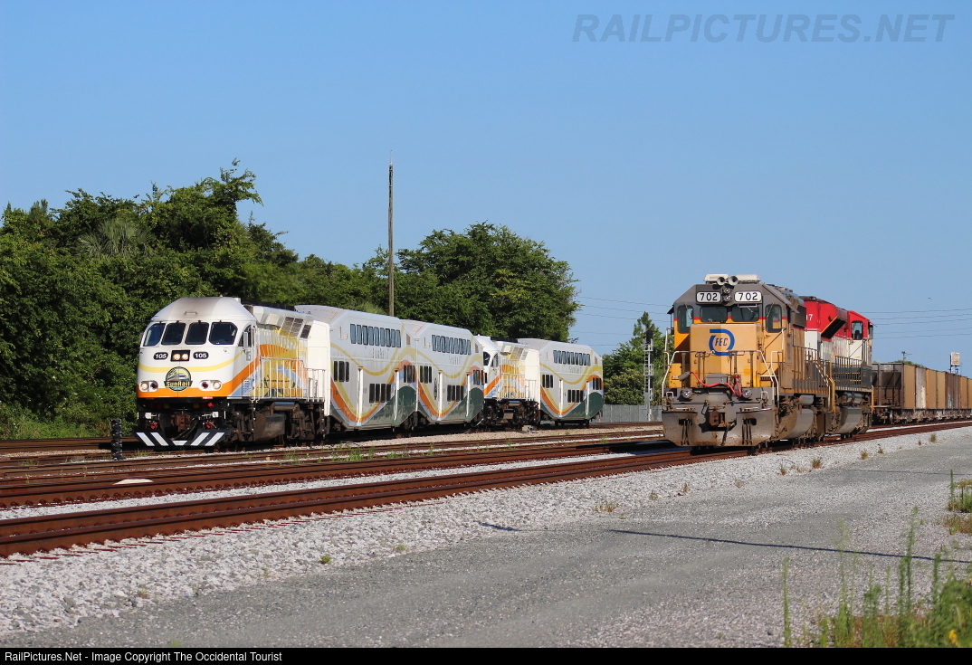 | For a few months in 2015, it was possible to get FEC & SunRail side-by-side. In this case, an extra move from the Auto Train maintenance facility is passing back to their own facility. |