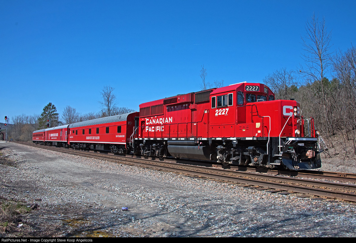 | Canadian Pacific's brand-new Tec Train (track inspection train) at CPC 131 Wadhams, NY as they continue their return trip back to Montreal. GP20C-ECO CP 2227/ |