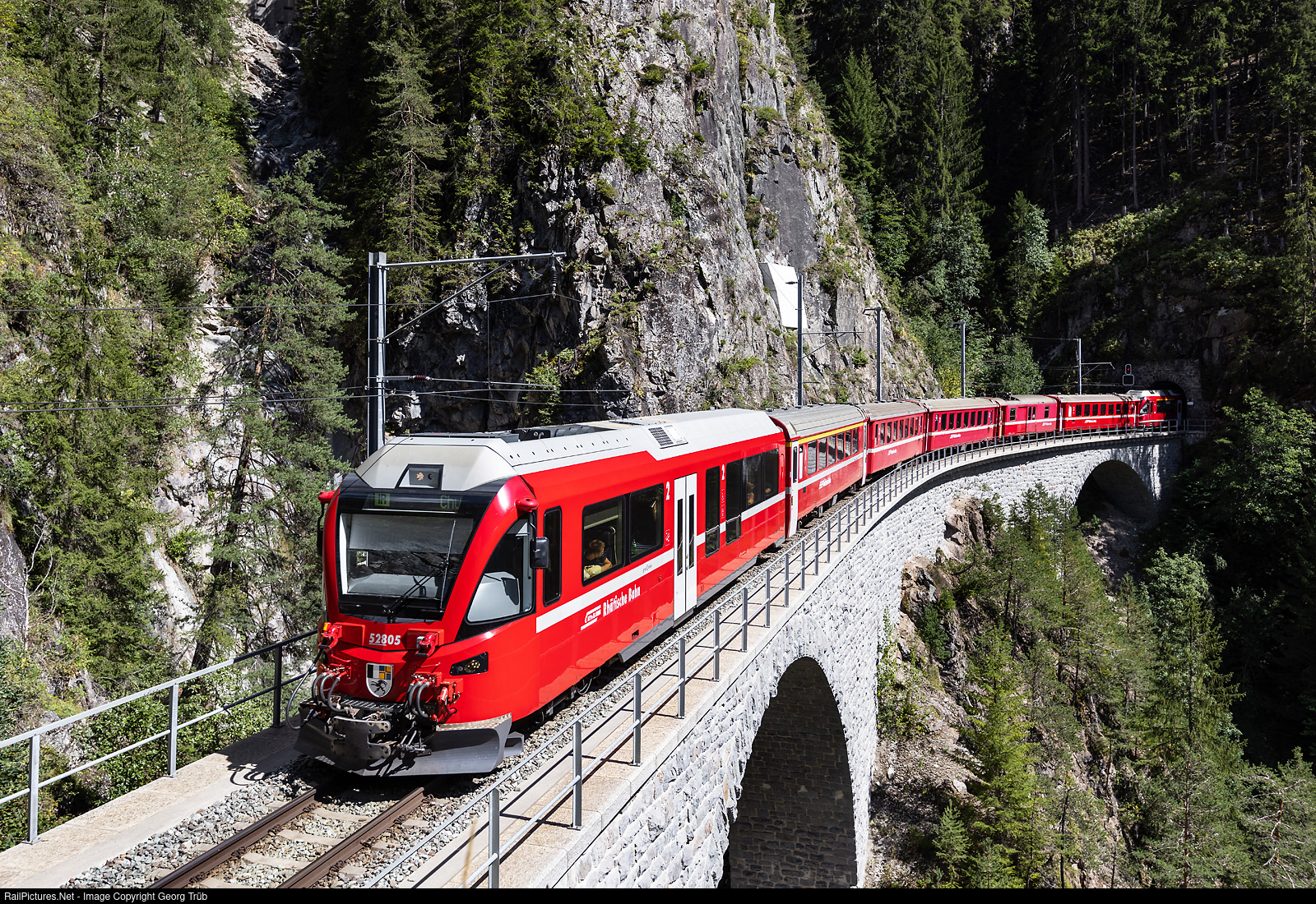 Interregio 1148 of the Rhaetian Railway from St.Moritz via the Albula line to Chur crosses the Stulsertobel Viaducts II and I between Stugl/Stuls and Filisur. Leading is the second class cab car Bt # 52805, followed by a first class unit car type IV, 2 second class cars type II, a baggage car and another unit car type II. At the end pushes the "Allegra" ABe 8/12 # 3506, which is just coming out of the 103 meter long Stulsertobeltunnel II. The interregio trains on the Albula line are usually shuttle trains of type ALVRA with a first class cab car At. But the RhB has only 6 ALVRA compositions and for the timetable they are all needed. If maintenance or repairs have to be done on a train, such a replacement composition, partly not air-conditioned, has to be used. In the future, once a so-called short turnaround of a few minutes in St.Moritz is planned, instead of a stay of 62 minutes in the current timetable. Then only 5 ALVRA compositions will be needed for the daily schedule, i.e. one will be reserve.