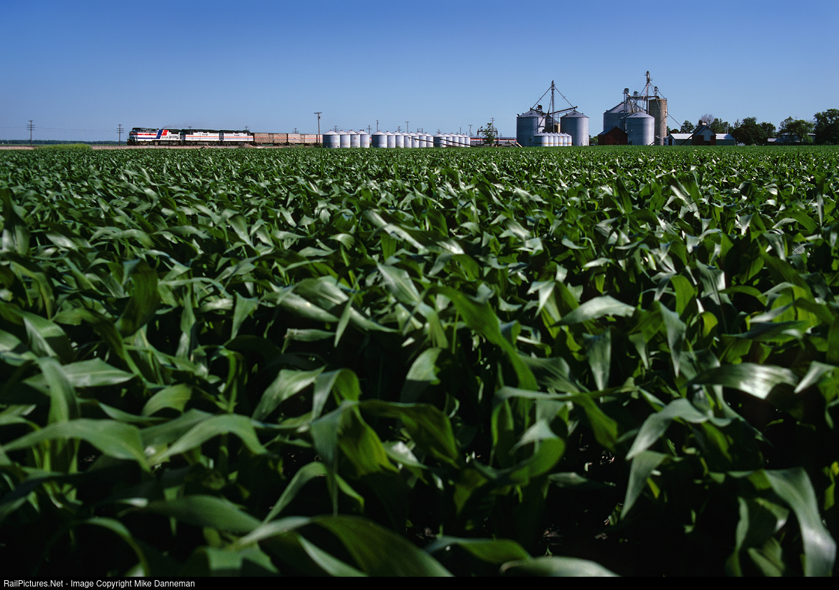 Amtrak’s eastbound Southwest Chief zips through Ancona, Illinois, on the afternoon of June 26, 1993—passing fields of corn that definitely will be beyond “knee high by Fourth of July.” Powering No. 4 is a B32BWH “Pepsi can” and a pair of older EMD F40PHs, and because of the corn fields here, you won’t even be able to see the tracks later in the summer when the crop is full grown.