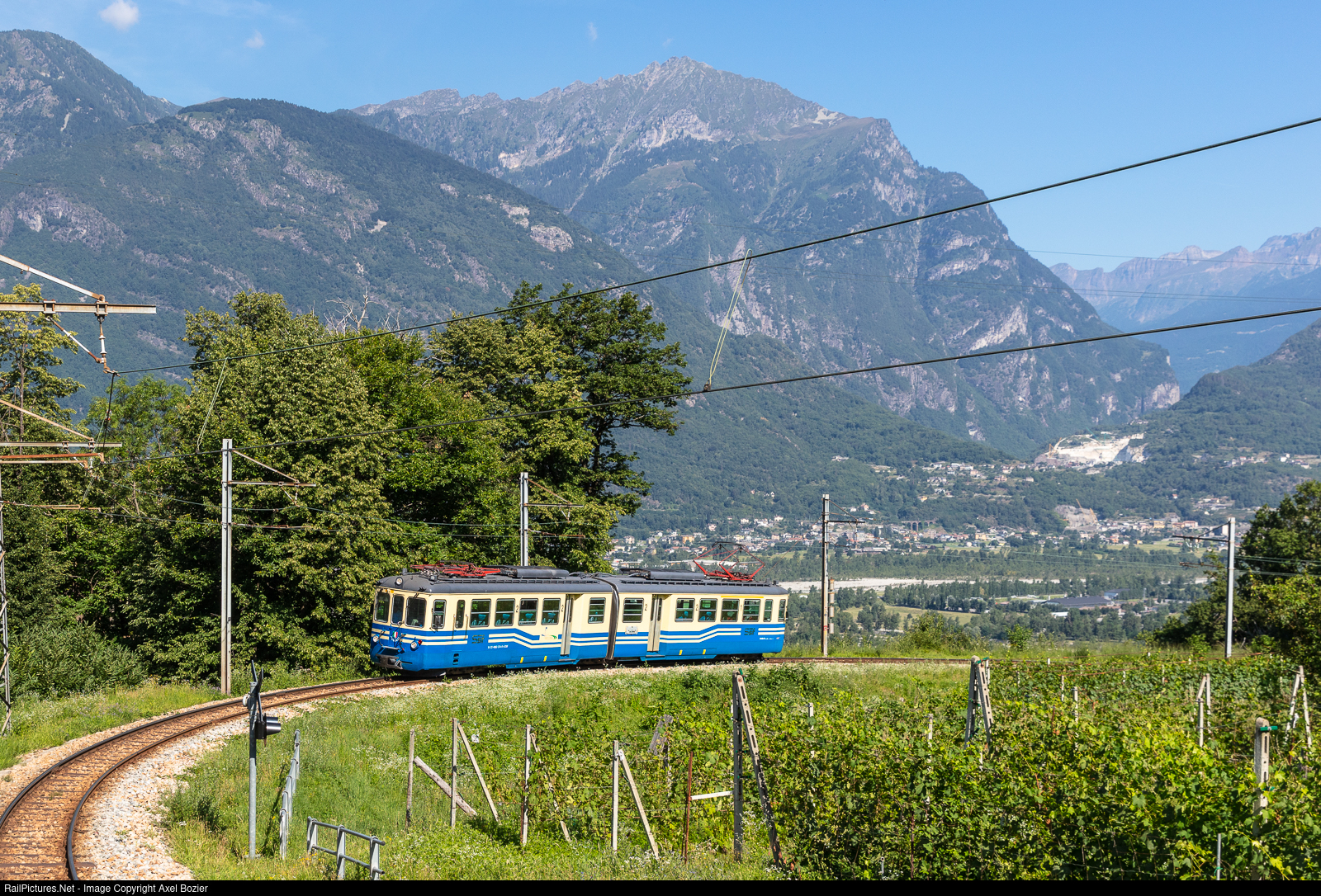 | Electric trainset ABe 6/6 #34 "Piemonte" of the SSIF (Società subalpina di imprese ferroviarie) is running uphill near Trontano on the Centovalli Railroad between Domodossola in Italy and Locarno in Switzerland. The Ossola Valley can be seen in the background.