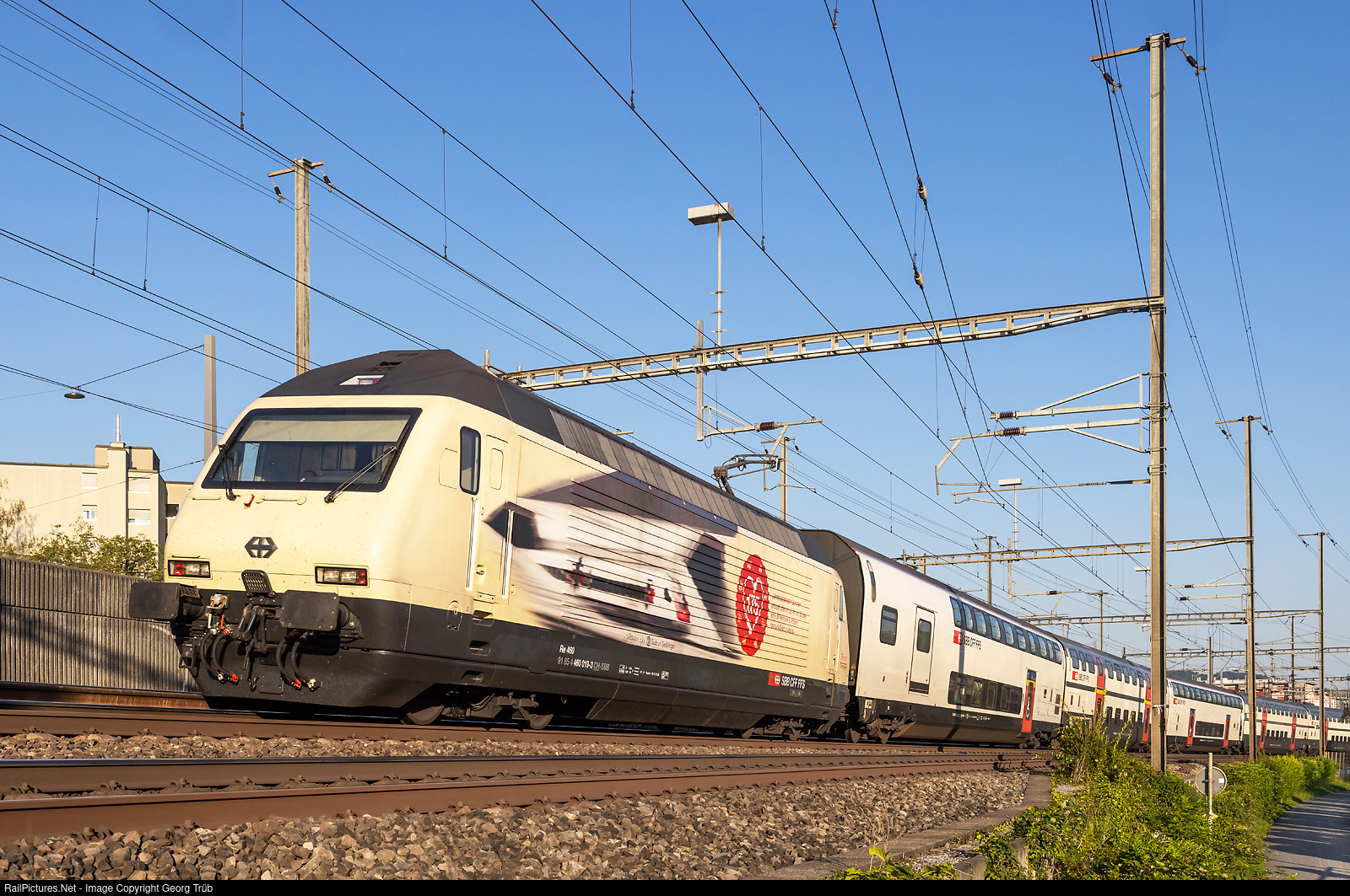 | Re 460 # 019 of the SBB in the publicity paint scheme for 175 years railways in Switzerland, is pulling the Interregio 2161 from Berne via Olten-Brugg-Baden to Zürich, through Dietikon. This is a IC2000/IC2020 push-pull train, with a modul of standard cars type IV in the rear (not visible). |