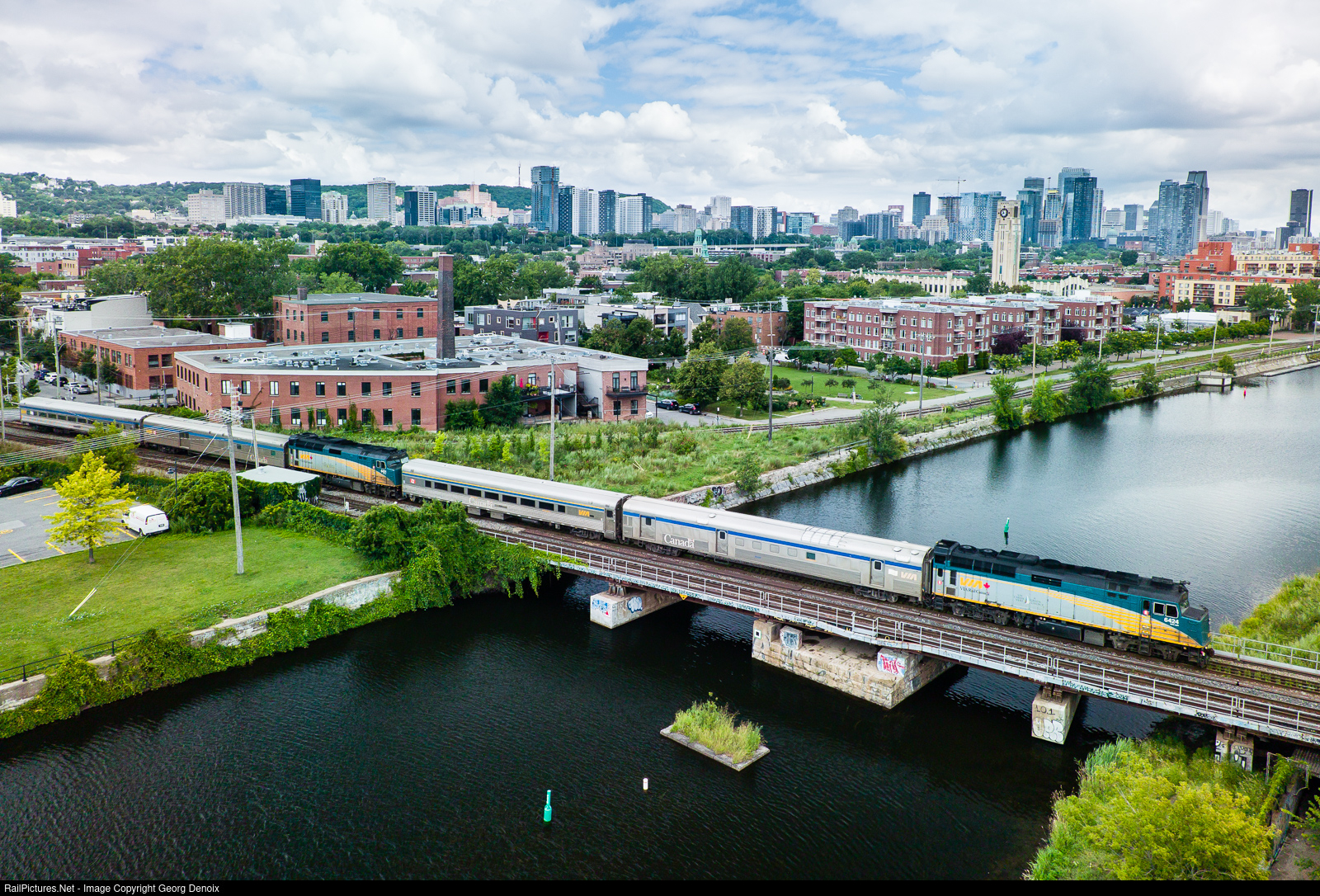 | For a few short weeks VIA changed it's Northern Québec trains (VIA 600/604 from Senneterre and Jonquière) to an overnight schedule so that they arrived in Montreal in the morning rather than at the end of the day as usual. Here the combined 600/604 crosses over the Lachine Canal with it's unique consist of stainless HEP cars - two locomotives, two baggage cars, and two coaches. |
