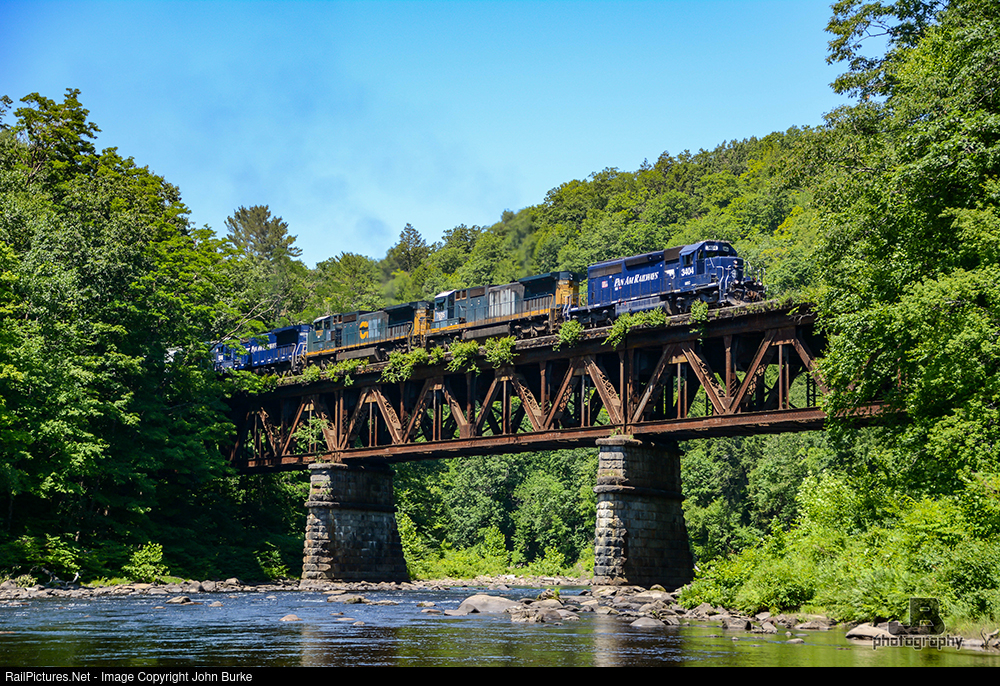| MEC 3404 Leads an Rotterdam Junction to East Deerfield freight over the Deerfield River on a warm Summer's day. Hard telling how long the Pan Am paint will last on the westend now that CSX has taken charge.. |